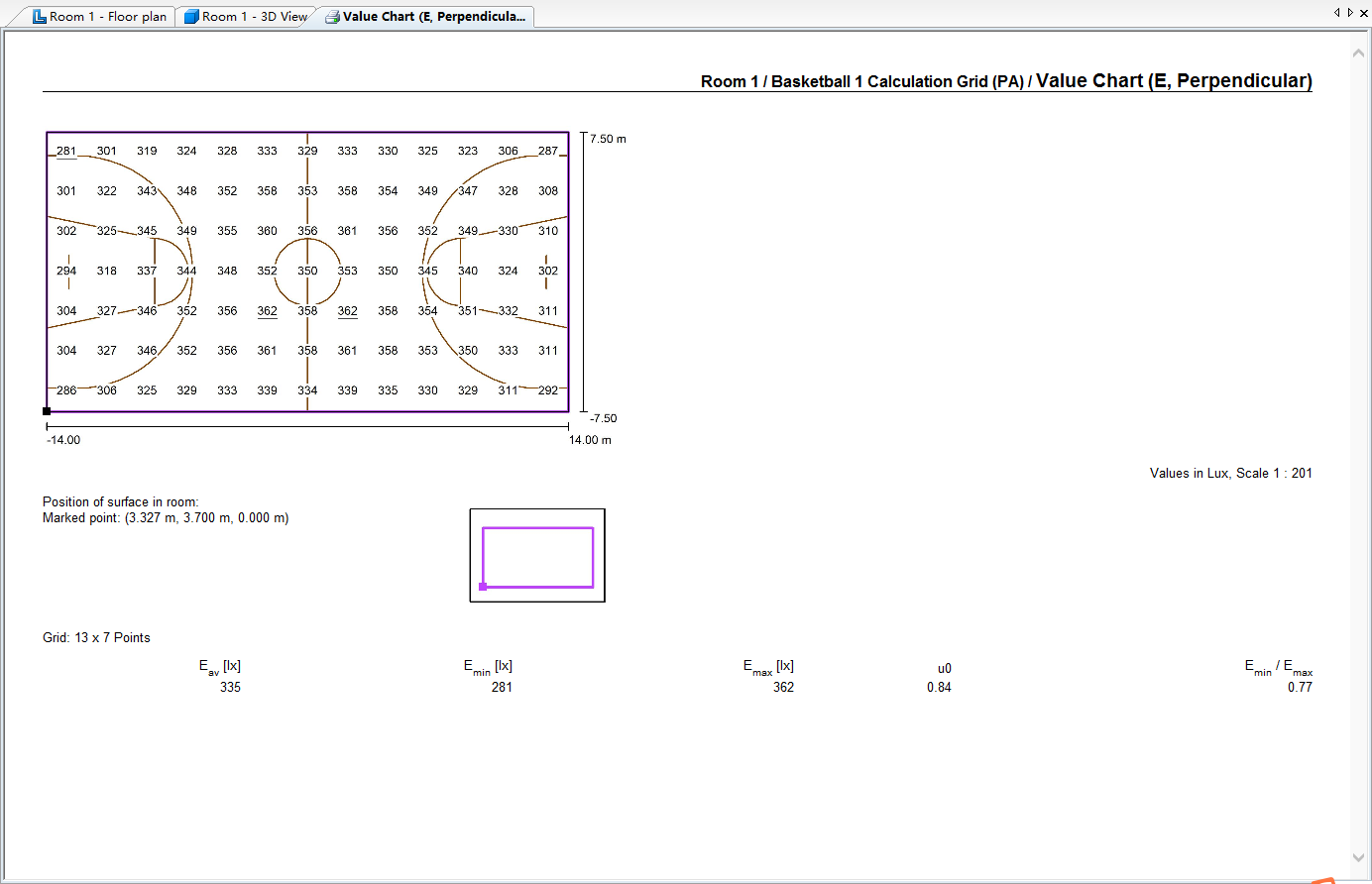 - Data: Average illuminance is 335 lux, and U0 is 0.84